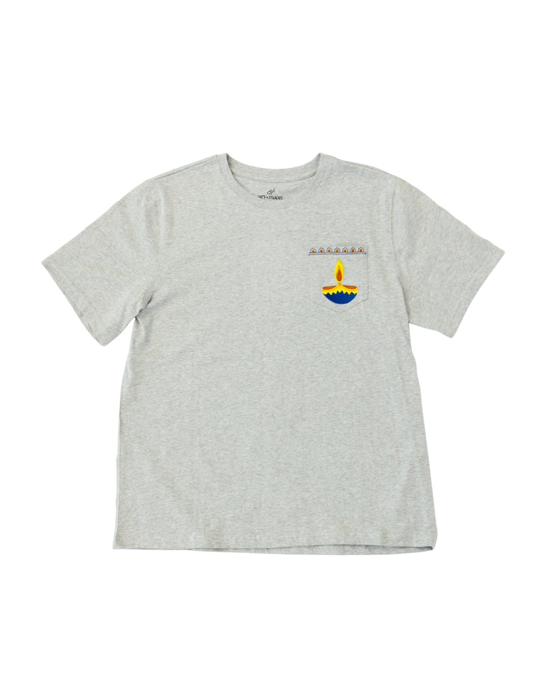 Your new favorite tee—elevated with cultural charm. This medium heather grey organic cotton shirt features a delicately embroidered pocket with elements inspired by our Blue Diya print. Soft, breathable, and designed to pair perfectly with our matching pants or robe, it’s subtle storytelling you’ll want to wear daily.