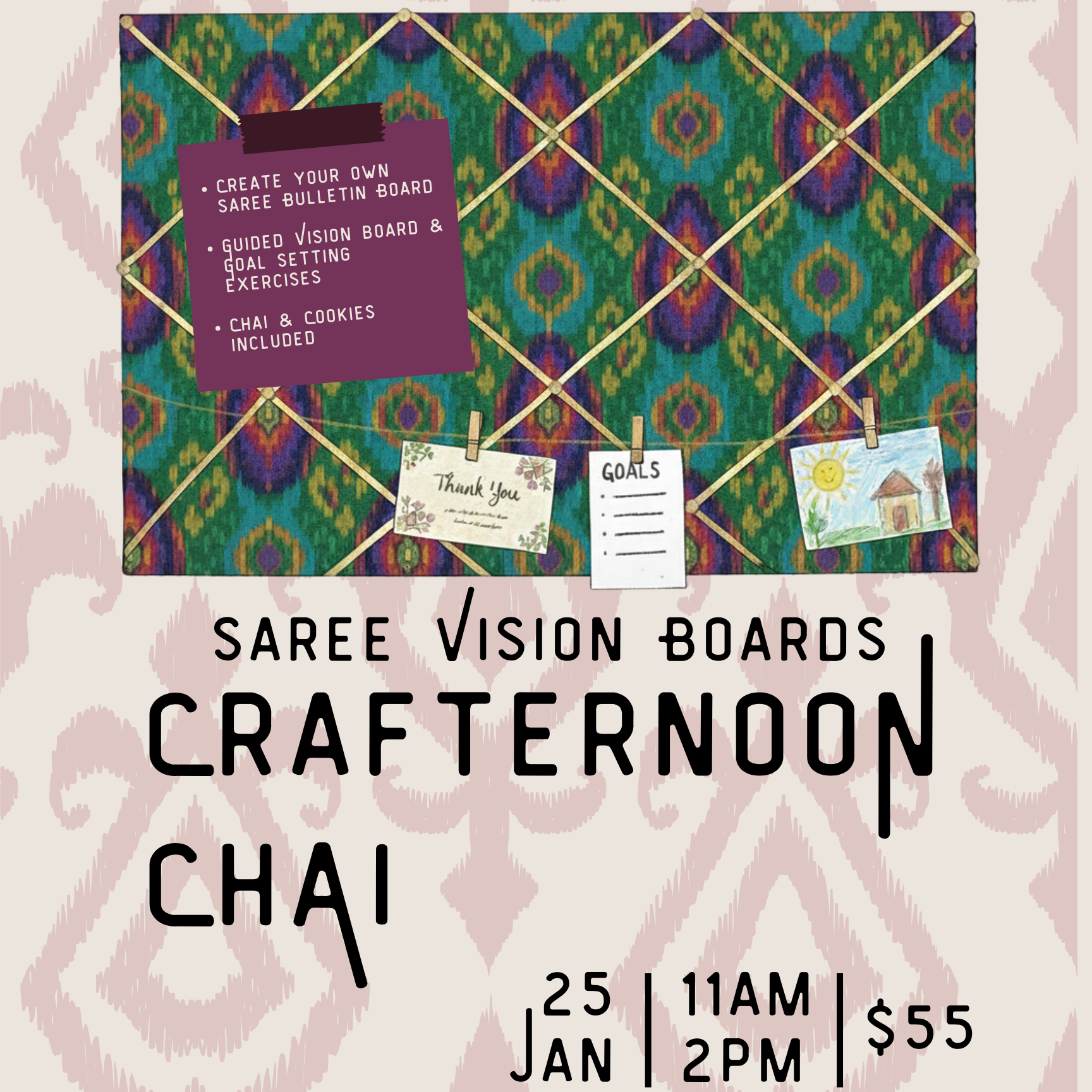 Come join us for an afternoon of art and creativity as we upcycle sarees into beautiful cork bulletin boards & set our 2026 intentions with guided vision board and goal planning via Aastha Madaan of Paperfly!