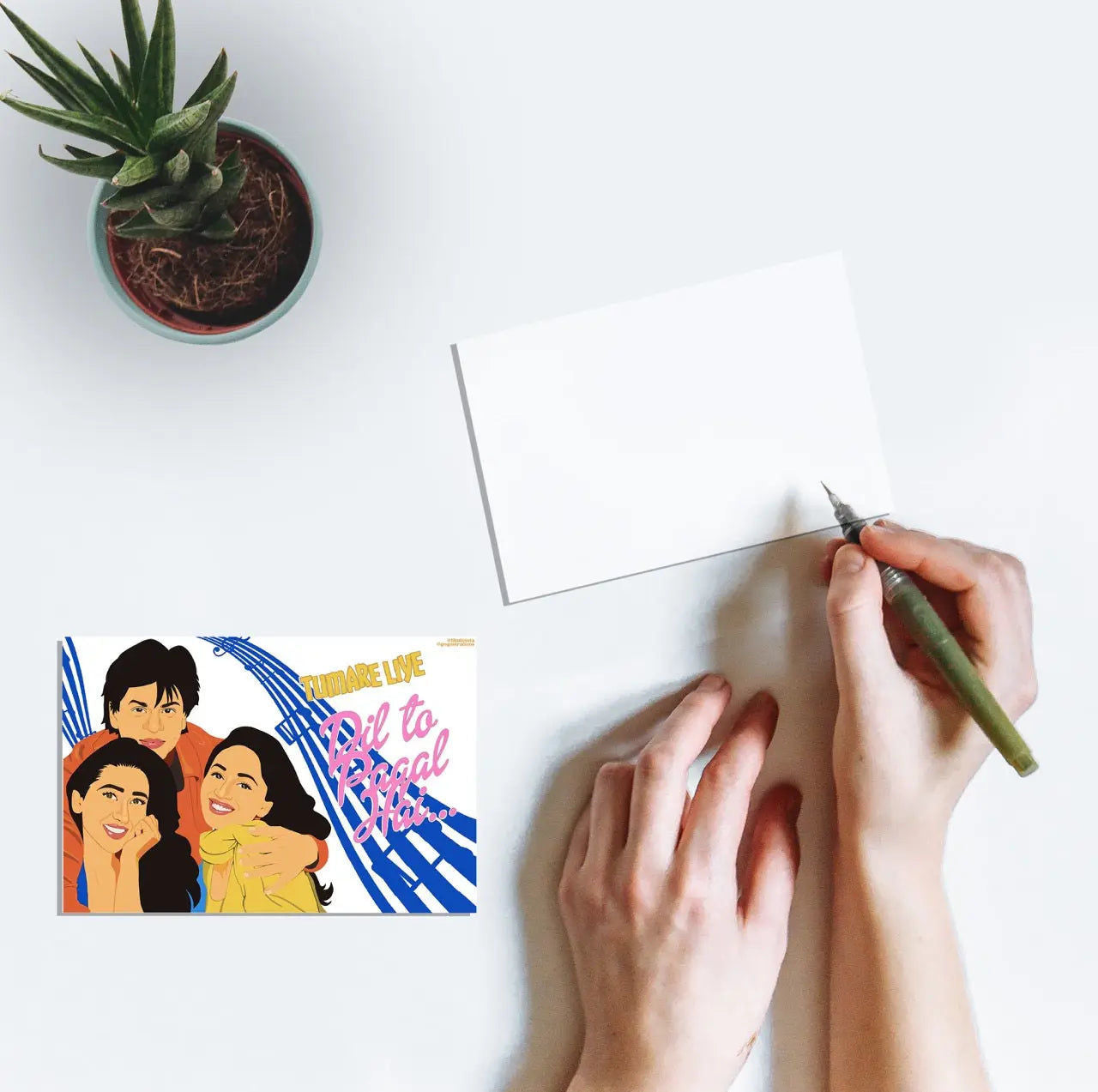 Send your feelings in true Bollywood style with this Dil To Pagal Hai postcard, starring Shah Rukh Khan, Madhuri Dixit, and Karisma Kapoor. Don't just say "I Love You", say "Dil To Pagal Hai". Perfect for writing heartfelt messages to loved ones near and far or adding as a piece of art to your space.