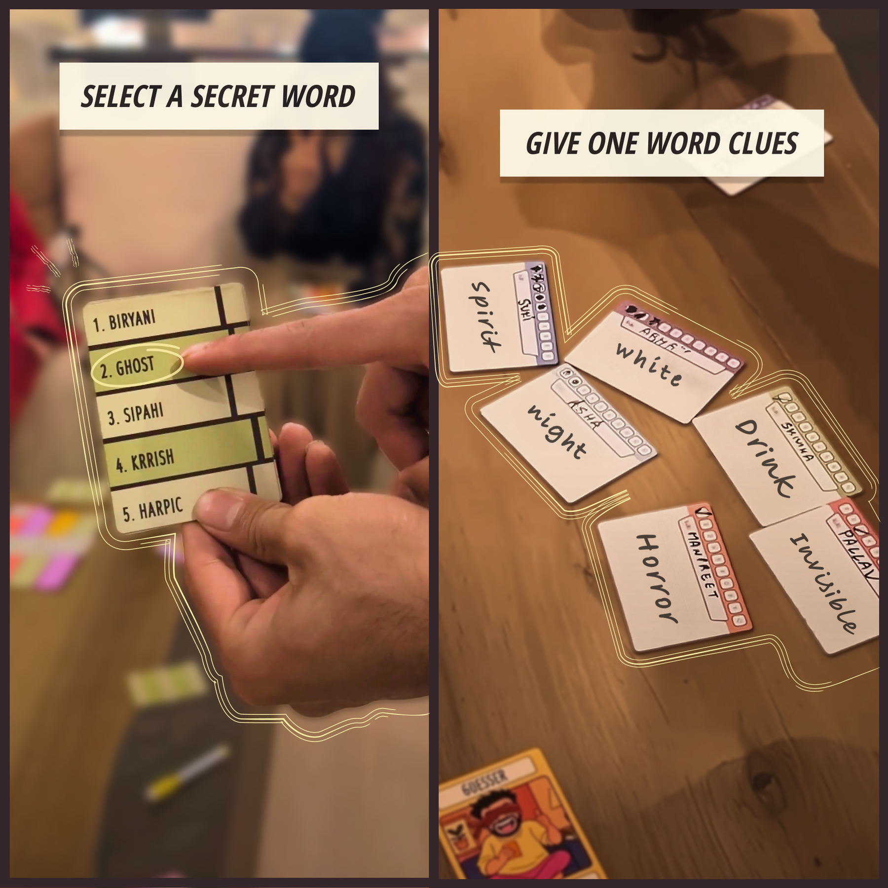 Word guessing party game with secret identities and disappearing clues!