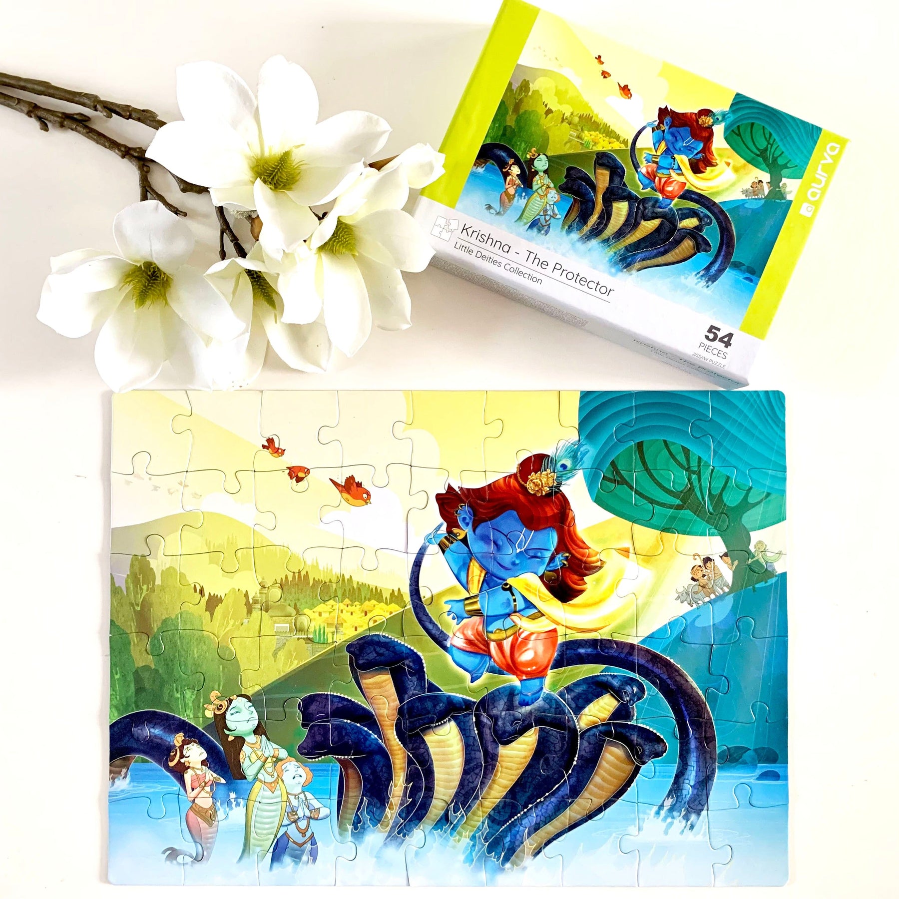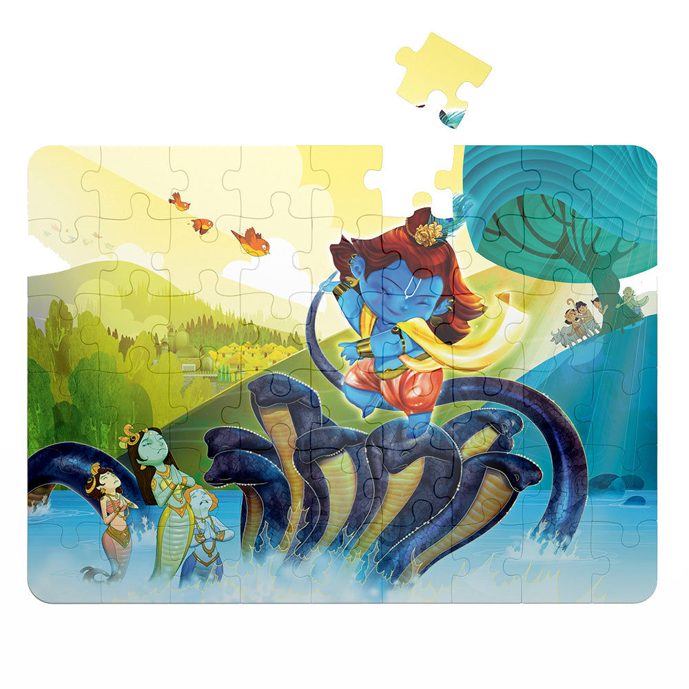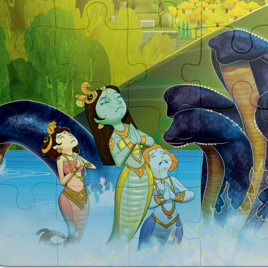 The Little Deities Collection of puzzles by Aurva, has been designed for children to discover and relish the unique stories of child deities from Hindu Mythology. This puzzle unfolds the tale behind Lord Krishna’s victory over the evil serpent Kaliya. Children explore Krishna’s descent into the River Yamuna to reach Kaliya, the infamous fight between the two and his famous dance over the serpent’s hood in victory.